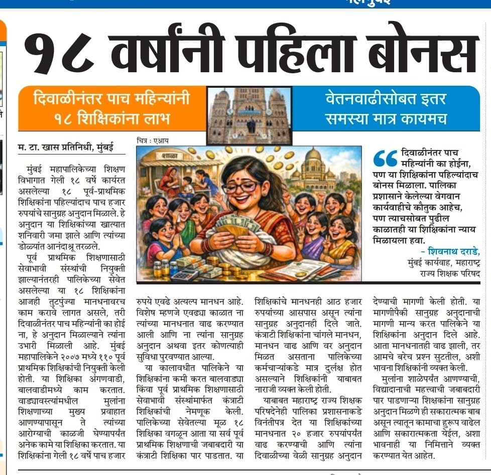 Read More१८ वर्षांनी पहिला बोनस दिवाळीनंतर पाच महिन्यांनी १८ शिक्षिकांना लाभ...