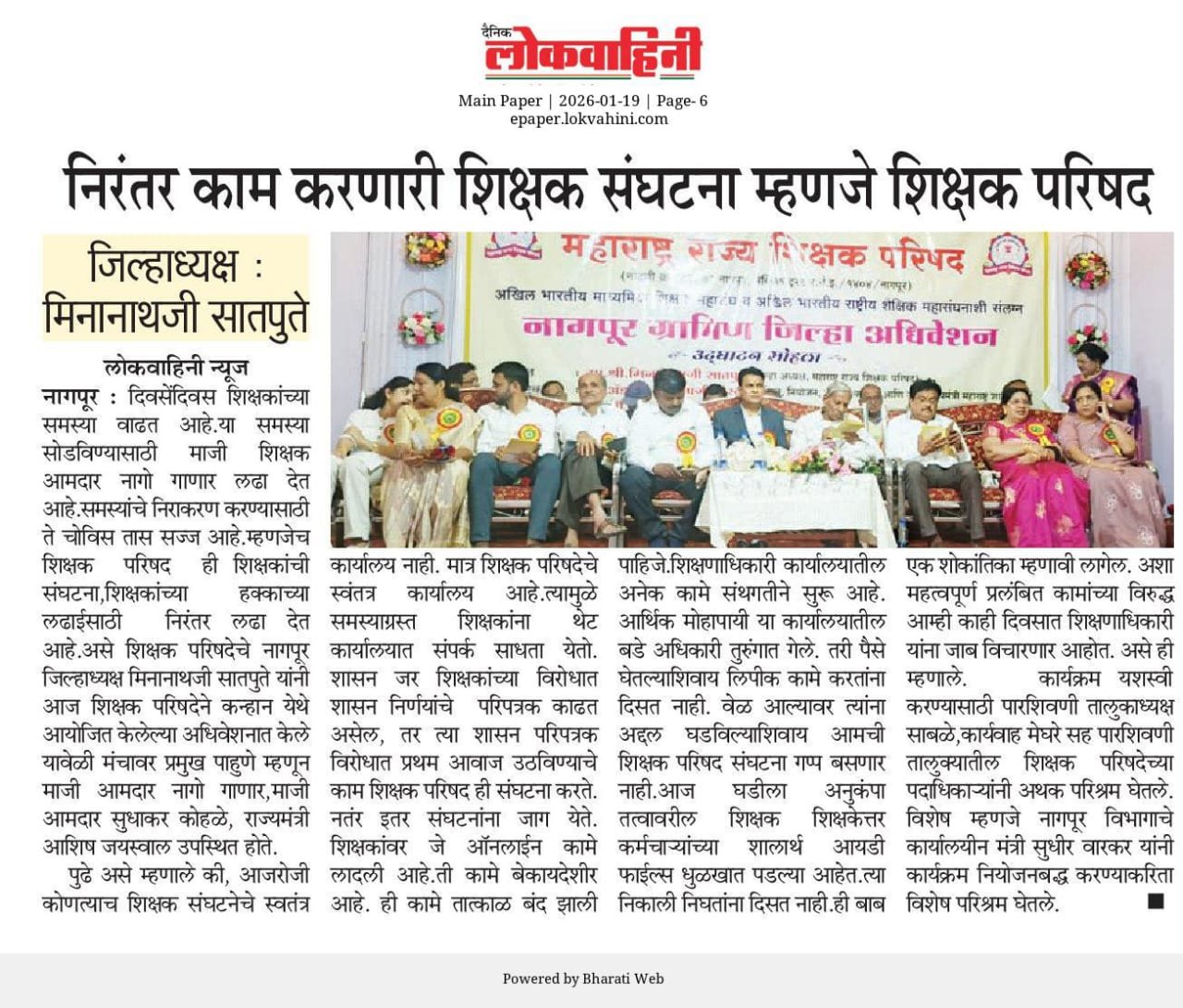 नागपूर : दिवसेंदिवस शिक्षकांच्या समस्या वाढत आहे. या समस्या सोडविण्यासाठी माजी शिक्षक आमदार नागो गाणार लढा देत आहे. समस्यांचे निराकरण करण्यासाठी ते चोविस तास सज्ज आहे. म्हणजेच शिक्षक परिषद ही शिक्षकांची संघटना, शिक्षकांच्या हक्काच्या लढाईसाठी निरंतर लढा देत आहे. असे शिक्षक परिषदेचे नागपूर जिल्हाध्यक्ष मिनानाथजी सातपुते यांनी आज शिक्षक परिषदेने कन्हान येथे आयोजित केलेल्या अधिवेशनात केले यावेळी मंचावर प्रमुख पाहुणे म्हणून माजी आमदार नागो गाणार, माजी आमदार सुधाकर कोहळे, राज्यमंत्री आशिष जयस्वाल उपस्थित होते.