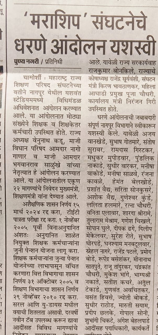 महाराष्ट्र राज्य शिक्षण परिषद संघटनेच्या वतीने नागपूर येथील यशवंत स्टेडियममध्ये विधिमंडळ अधिवेशनात आंदोलन करण्यात आले. या आंदोलनात मोठ्या संख्येने शिक्षक व शिक्षकेतर कर्मचारी उपस्थित होते. राज्य अध्यक्ष वेनुनाथ कडू, माजी विधान परिषद आमदार नागो गाणार व माजी आमदार भगवानराव साळुंखे यांच्या नेतृत्वात हे आंदोलन करण्यात आले. या आंदोलनातील एकूण २२ मागण्यांचे निवेदन मुख्यमंत्री, शिक्षणमंत्री यांना देण्यात आले.